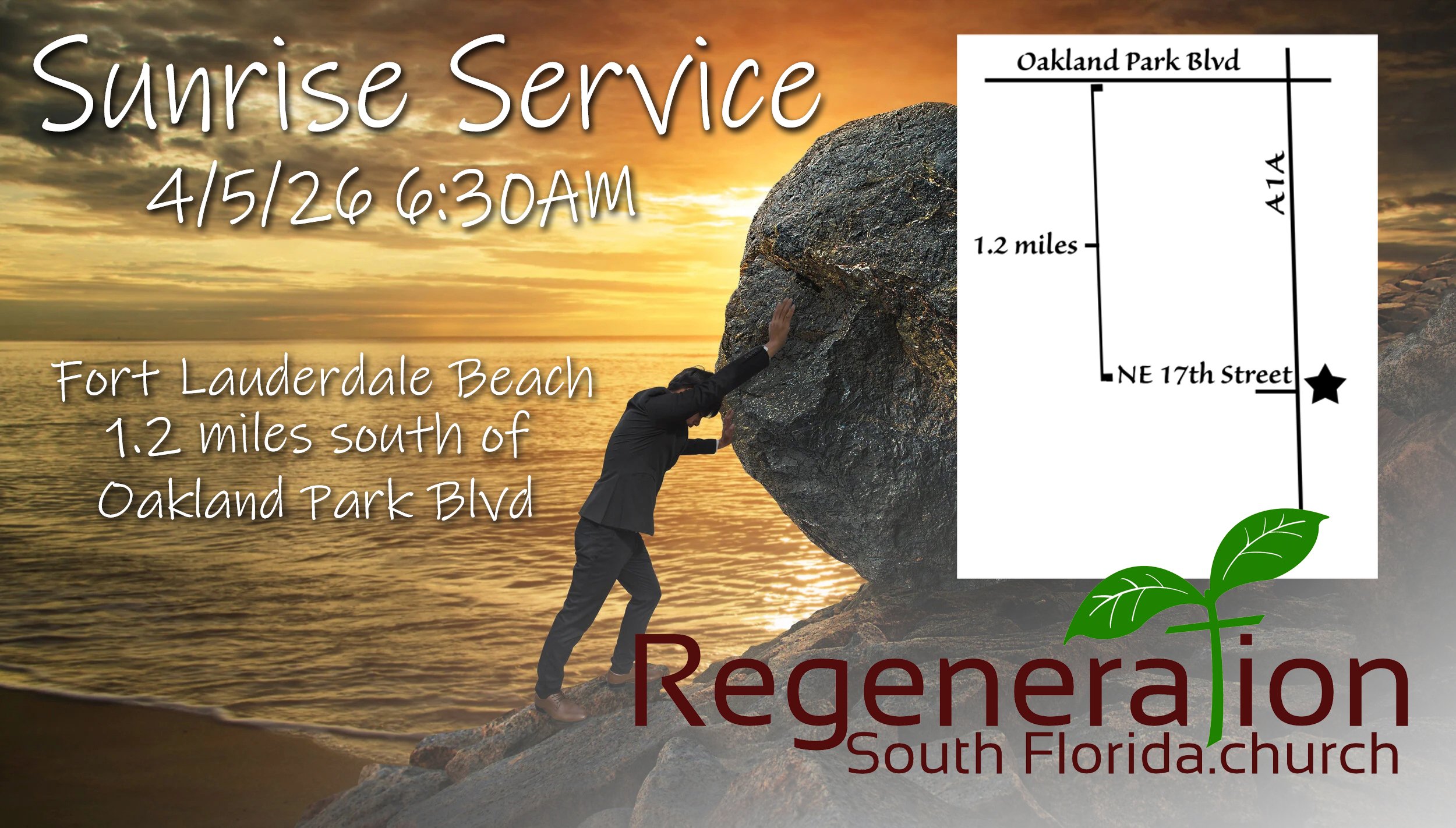 Resurrection Sunday is 4/5/26. Please join us for a Sunrise Service on Fort Lauderdale beach. We will meet 1.2 miles south of Oakland Park Boulevard. Parking is available on A1A. See graphic and Google Maps link for details.